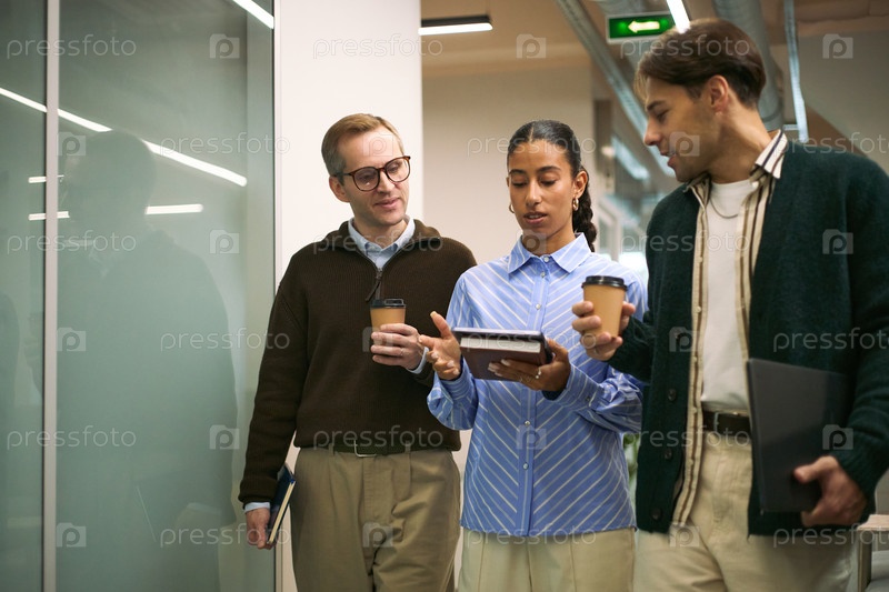 Мультиэтнические молодые взрослые обсуждают бизнес-стратегию во время прогулки по офису
