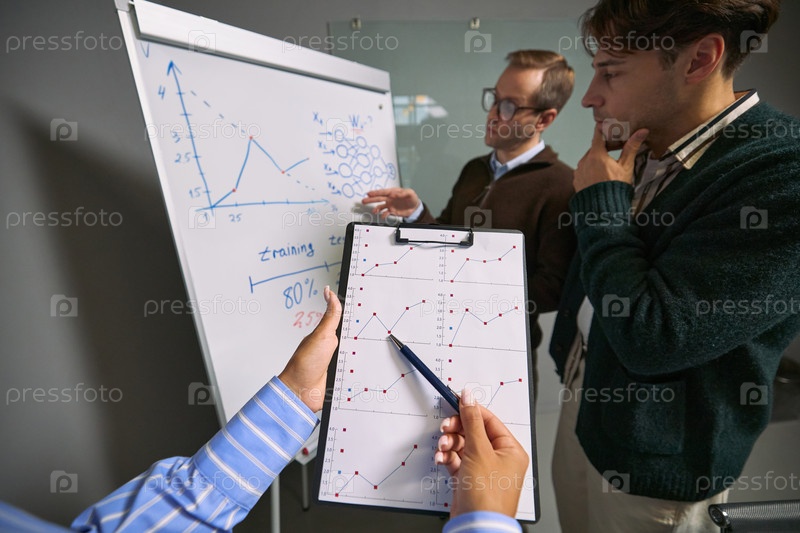 Мультиэтнические молодые взрослые мужчины, анализирующие бизнес-данные во время офисной встречи