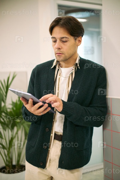 Молодой взрослый мужчина использует цифровой планшет в современном офисе