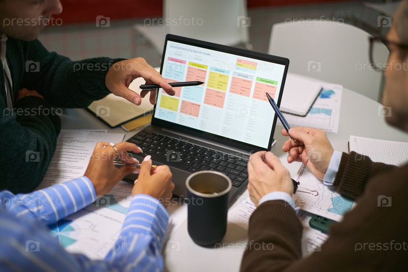 Группа молодых взрослых мужчин, сотрудничающих в бизнес-проекте с использованием ноутбука