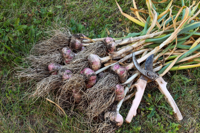 Выкопанный и сушеный чеснок готов обрезать зеленые стебли