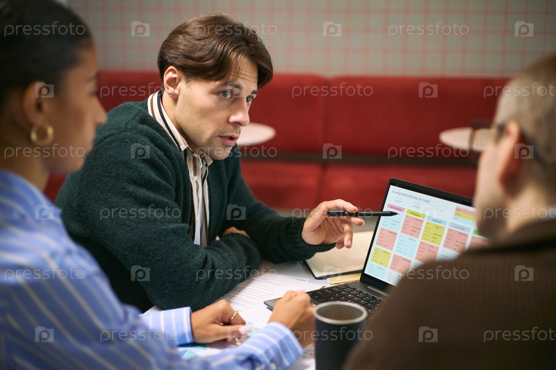 Молодой взрослый мужчина, ведущий деловую встречу с многонациональными коллегами