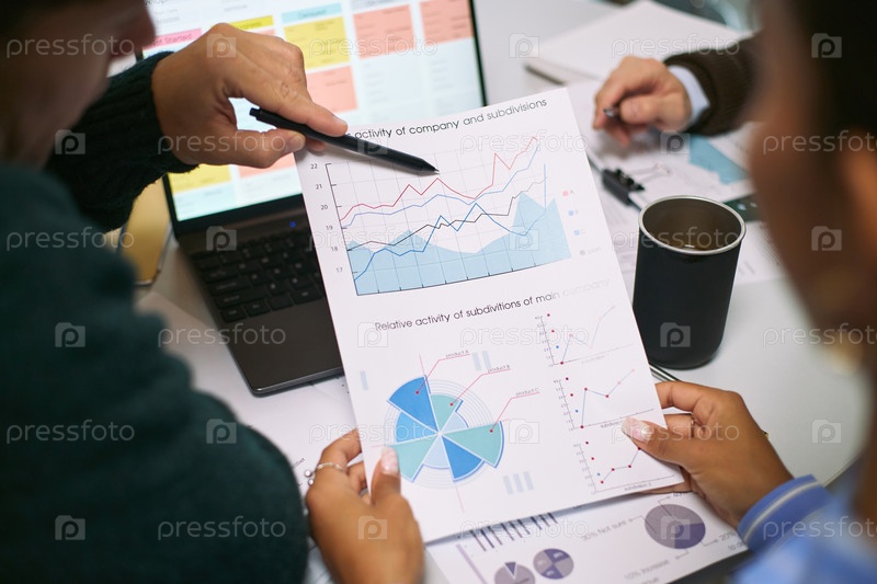Мультиэтнические деловые коллеги анализируют финансовые графики во время встречи