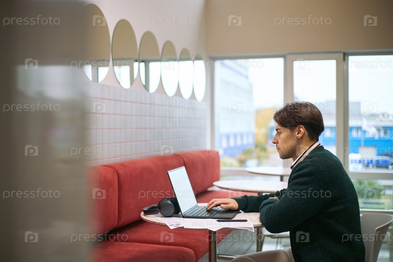 Молодой человек работает удаленно на ноутбуке в современном бизнес-кафе