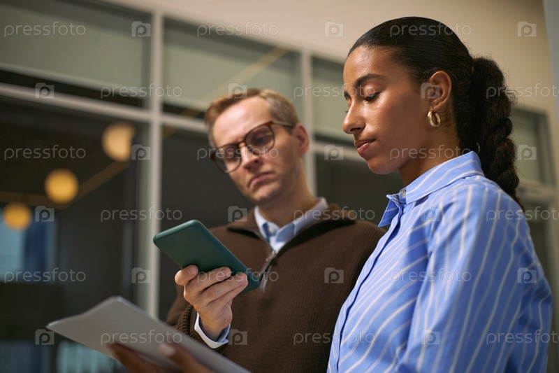 Молодой человек и молодая чернокожая женщина сотрудничают в современном офисе