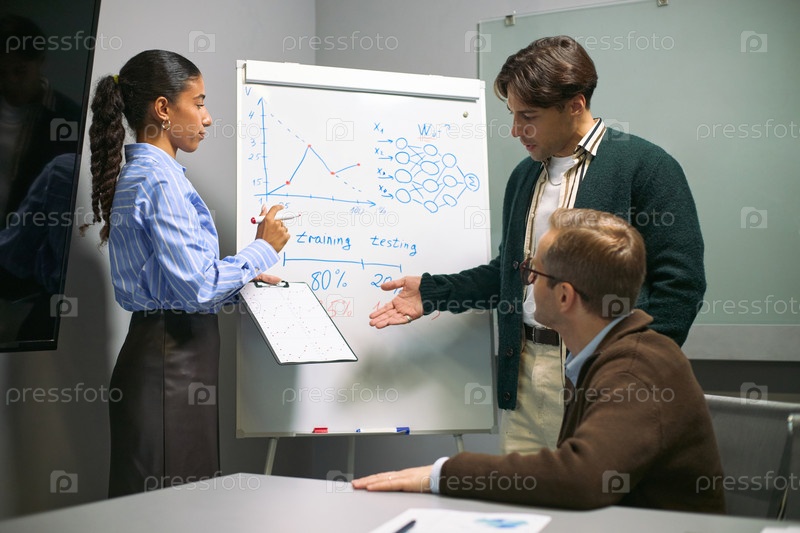 Мультиэтнические молодые взрослые обсуждают бизнес-данные во время офисной встречи