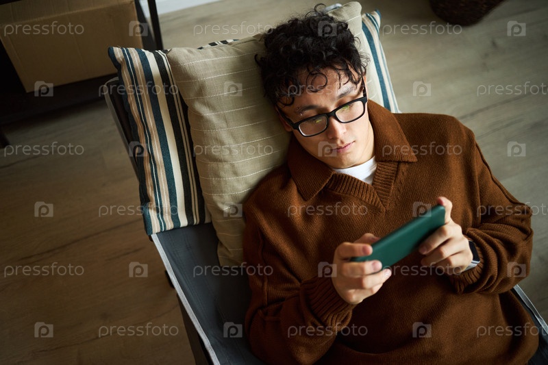 Молодой взрослый азиатский мужчина отдыхает в помещении, используя смартфон на стуле
