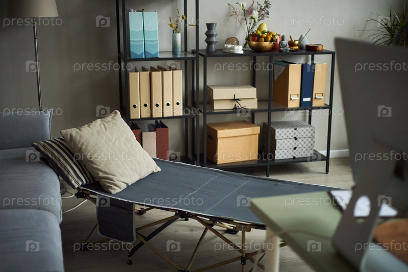 Пустой офисный интерьер, показывающий складную кроватку и организованное рабочее пространство