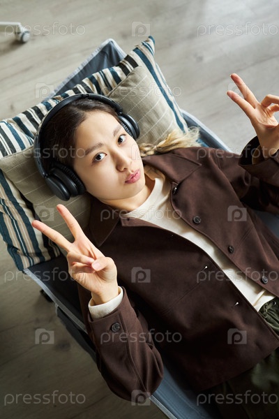 Портрет молодой азиатской женщины, расслабляющейся с наушниками и делающей знаки мира