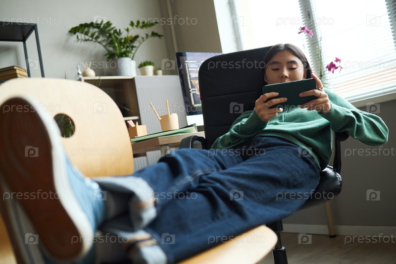 Молодая азиатская бизнесвумен расслабляется в офисном кресле, используя смартфон во время перерыва