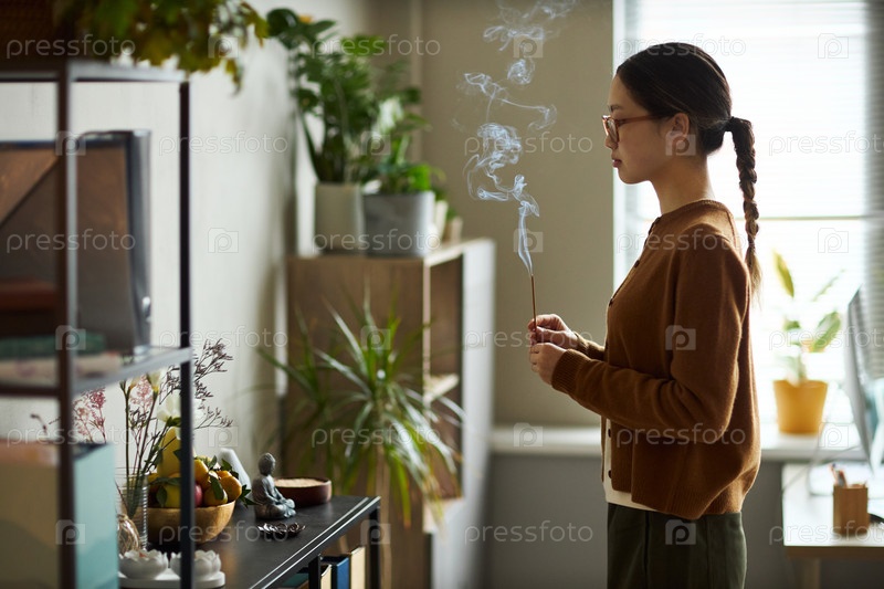 Молодая азиатская женщина стоит в помещении, держит палку с фимиамом и медитирует