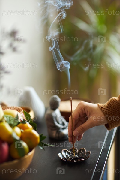 Молодая азиатская женщина зажигает фимиам в офисе для расслабления