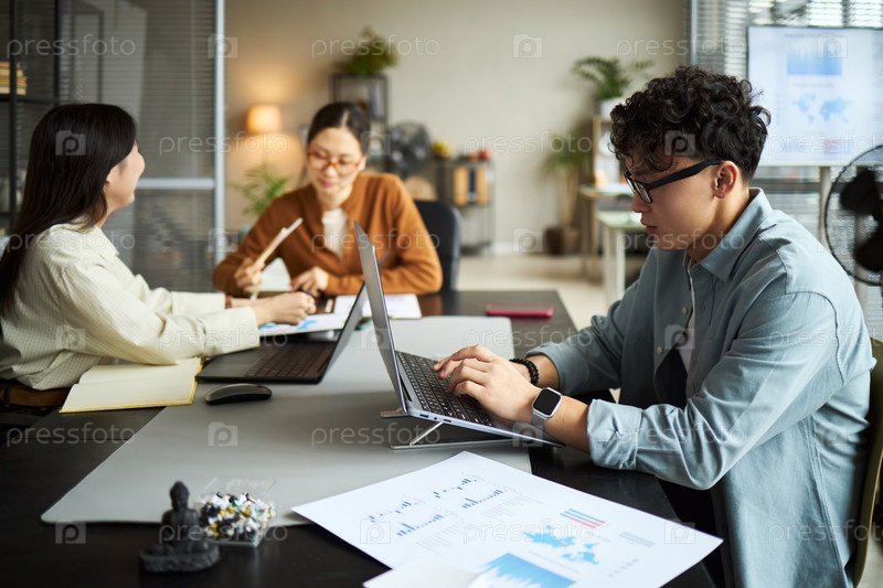 Молодые азиатские бизнесмены и женщины сотрудничают в современном офисном рабочем пространстве