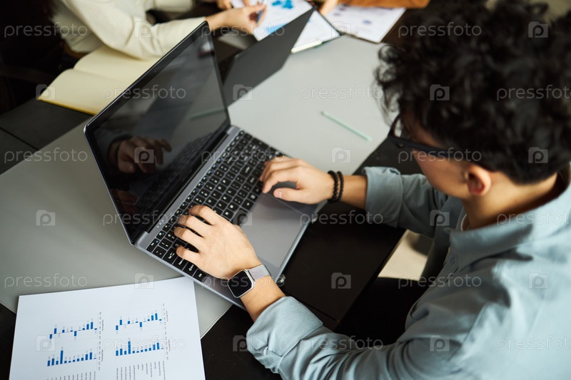 Молодой азиатский бизнесмен работает на ноутбуке с коллегами в офисной встрече