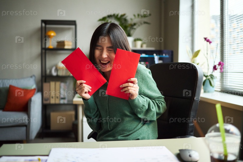 Молодая азиатская бизнесвуменка празднует успех, держа красные конверты в офисе
