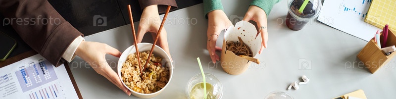 Молодые азиатские бизнесмены и деловые женщины обедают вместе в офисе