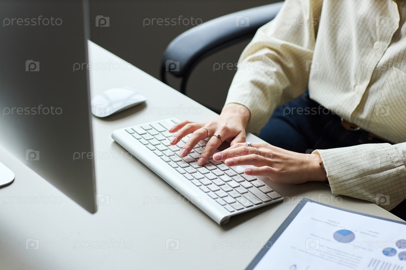 Молодая азиатская деловая женщина печатает на компьютерной клавиатуре в современном офисе