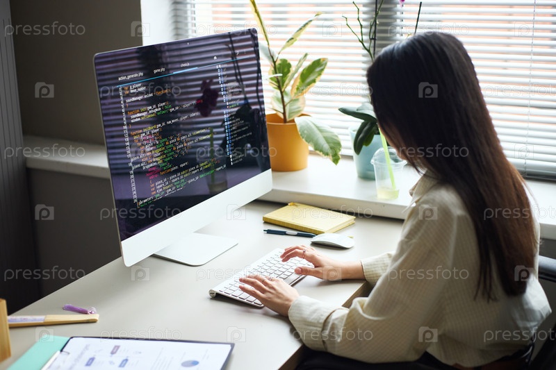 Молодая азиатская бизнесвумен работает над компьютерным кодированием в современном офисе