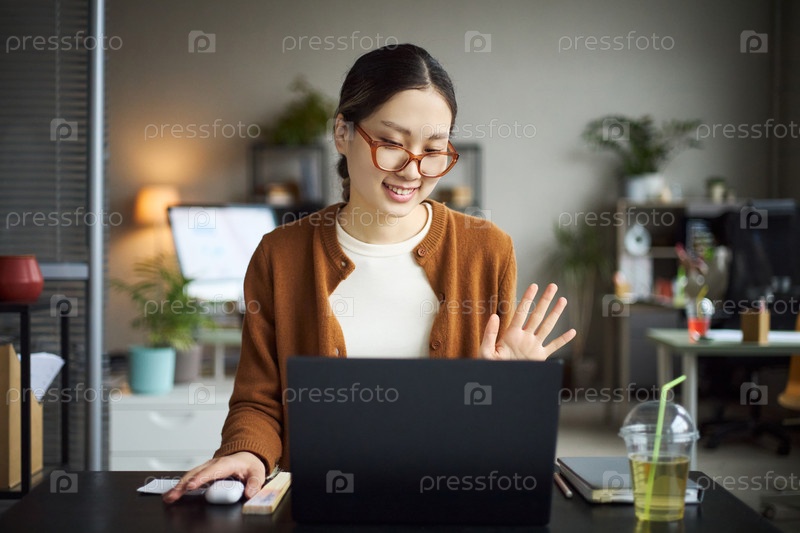 Юная азиатская бизнесвумен улыбается, махая во время онлайн-встречи в офисе