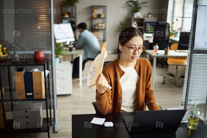 Молодая азиатская бизнесвумен, работающая за столом и охлаждающая себя с фанатом