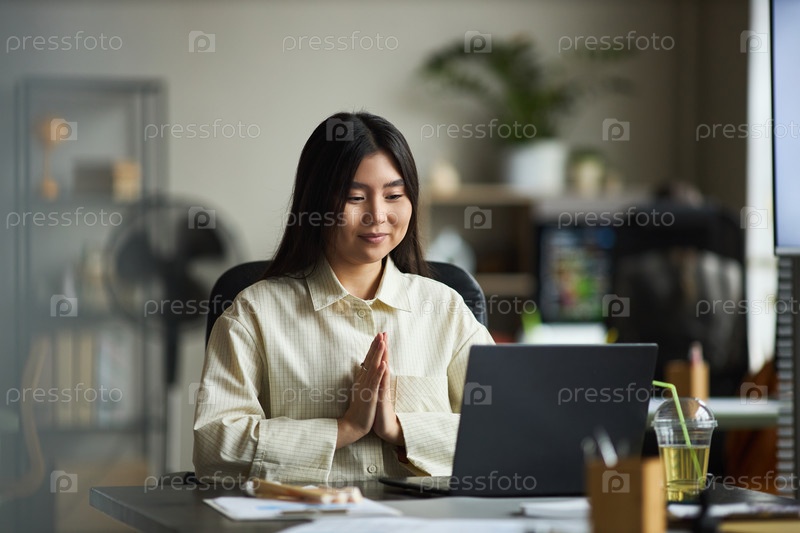 Молодая азиатская бизнесвумен улыбается, работая удаленно в офисной обстановке
