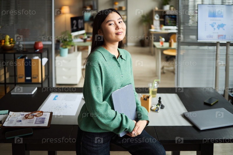 Портрет молодой азиатской деловой женщины, держащей папку во время работы в офисе