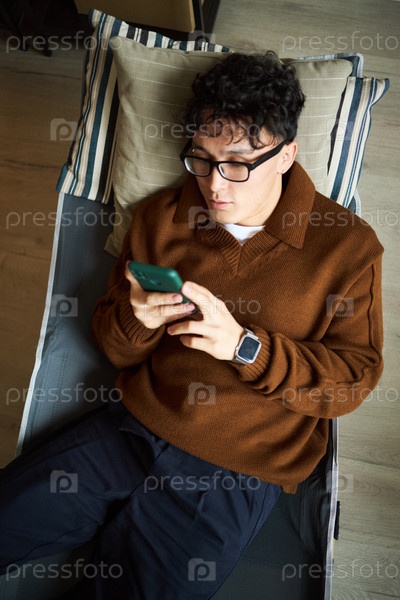 Молодой азиатский мужчина лежит на диване, используя смартфон и носящий часы