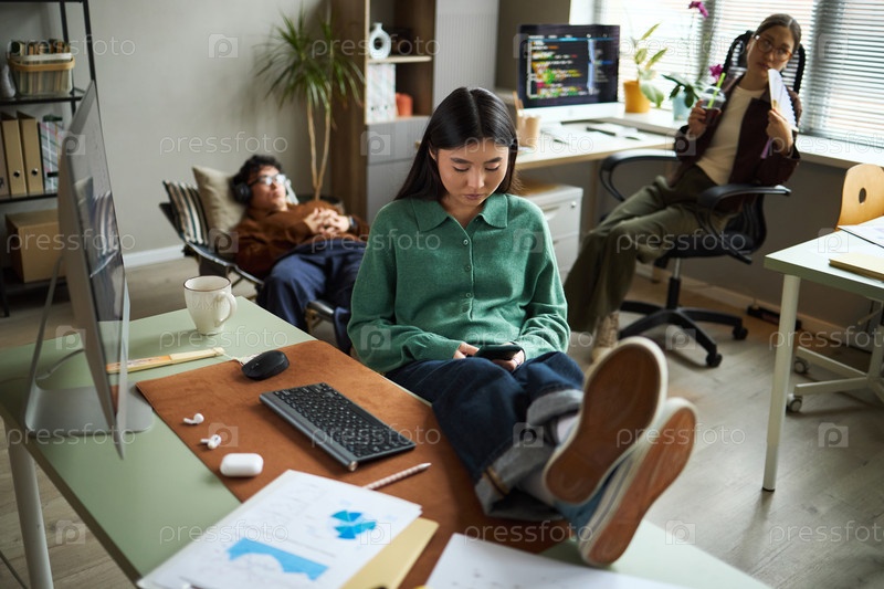 Молодые азиатские бизнесмены и деловые женщины расслабляются и работают в офисе