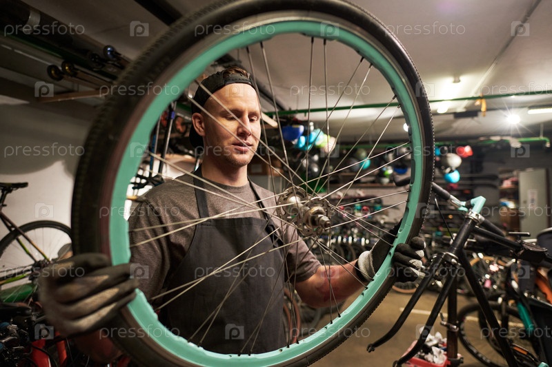 Молодой человек держит колесо велосипеда во время проверки выровнения ремня
