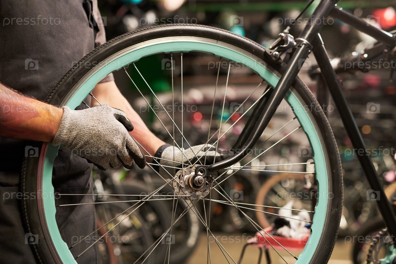 Молодой человек, ремонтирующий колесо велосипеда в мастерской Young Man Repairing Bicycle Wheel in Workshop Setting