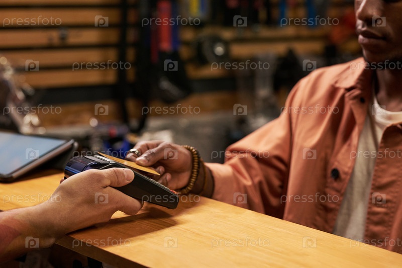 Молодой чернокожий мужчина делает бесконтактные платежи с помощью читателя кредитных карт