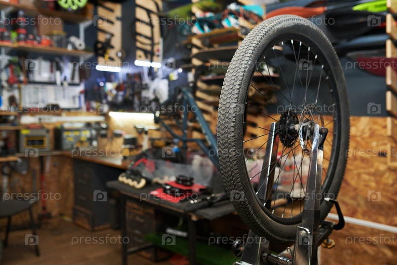 Колесо велосипеда, которое ремонтируется в мастерской с видимыми инструментами и оборудованием