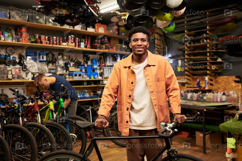 Молодой чернокожий мужчина улыбается, стоя с велосипедом в мастерской