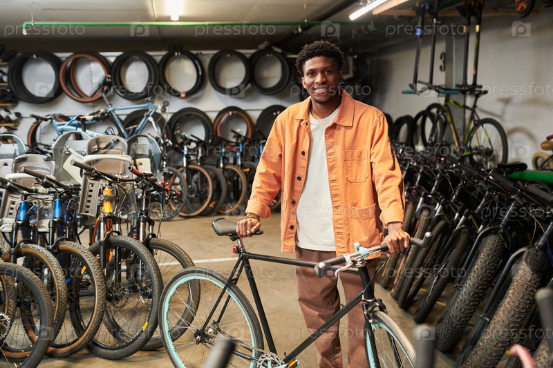 Молодой чернокожий мужчина стоит в велосипедном магазине, держит велосипед и улыбается