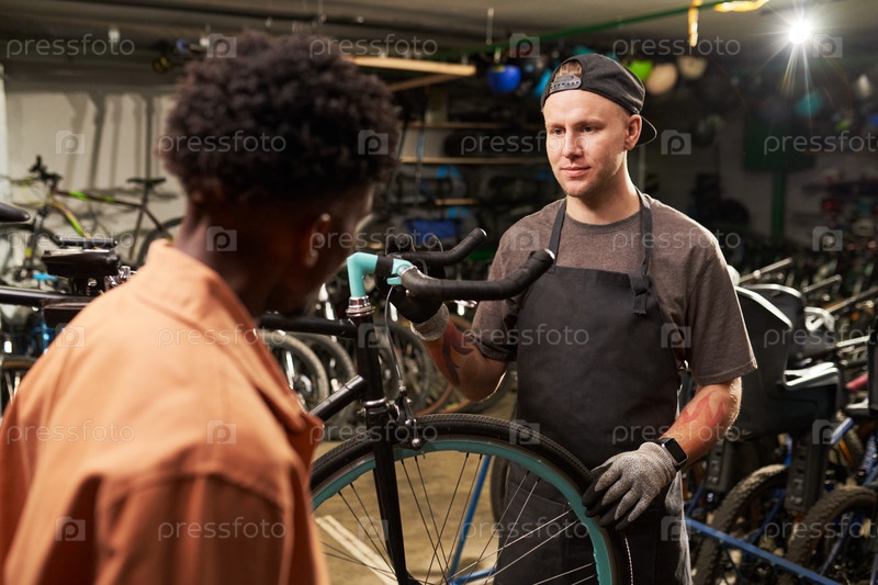 Молодой человек помогает черному молодому человеку с ремонтом велосипеда