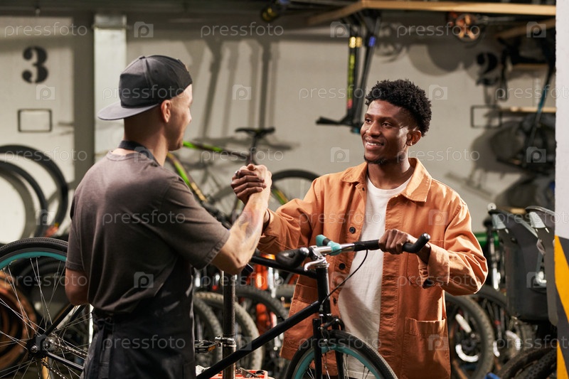 Молодой чернокожий мужчина приветствует молодого человека во время ремонта велосипеда в помещении