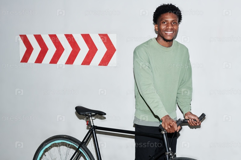 Молодой чернокожий мужчина улыбается, держа велосипед в помещении возле знака стрелы