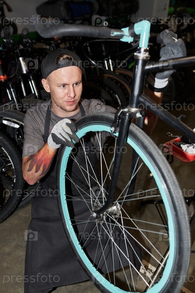 Молодой человек, ремонтирующий колесо велосипеда в мастерской Young Man Repairing Bicycle Wheel in Workshop Setting