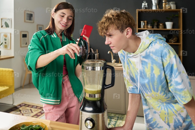 Подростковая девушка смешивает смузи, пока подросток смотрит