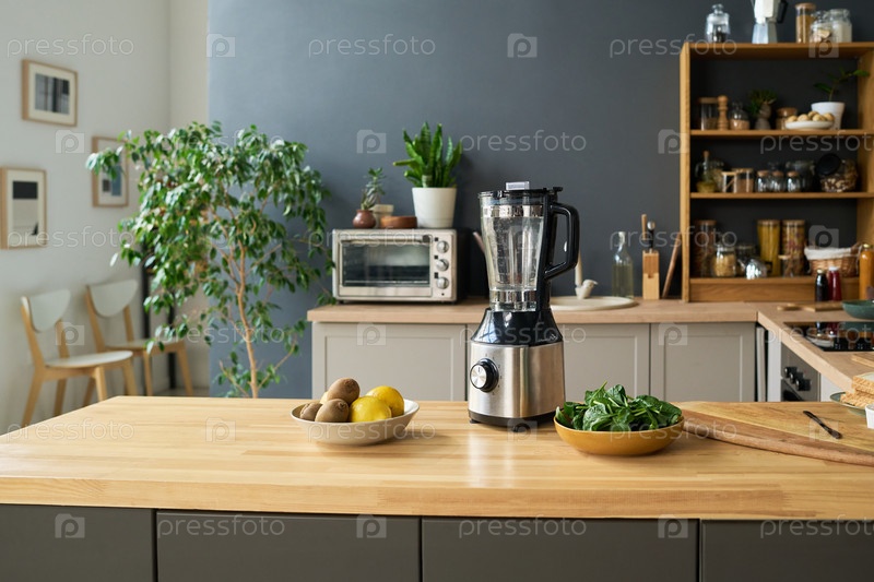 Электрический блендер на деревянном кухонном столе В окружении свежих продуктов