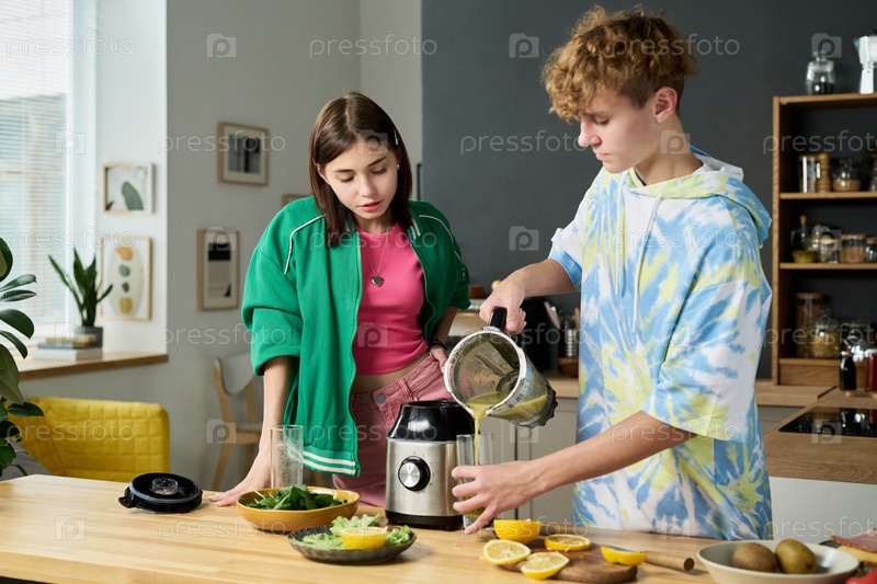 Подросток наливает сок, в то время как девочка-подросток наблюдает