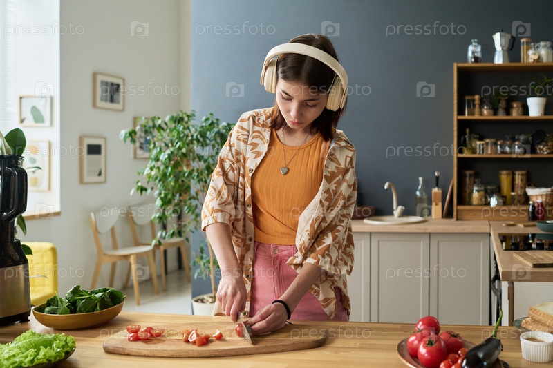 Девушка-подросток с наушниками готовит салат на современной кухне