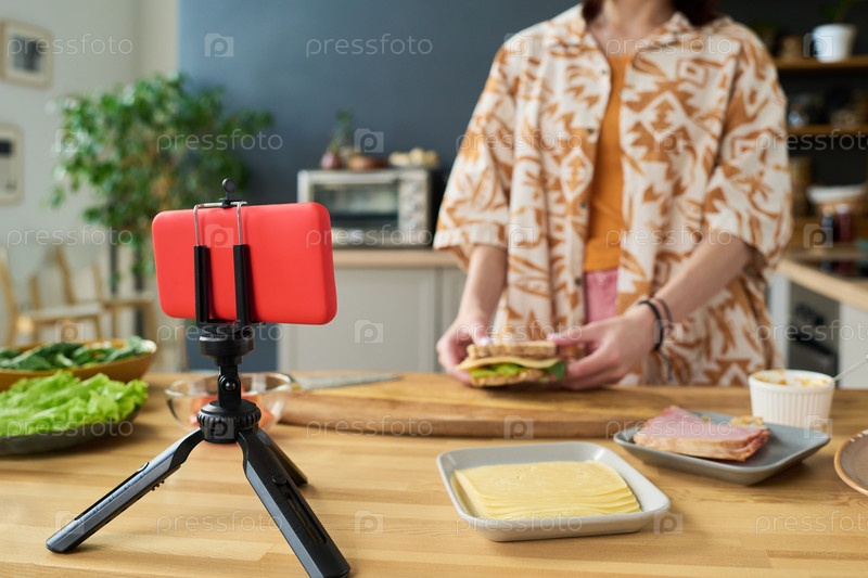 Молодая девушка готовит бутерброд, записывая видео кулинарии