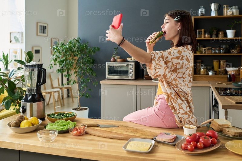 Девушка-подросток сидит на кухонном столе, делая селфи во время еды бутерброда