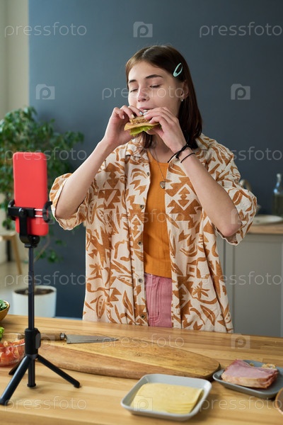 Подростка дегустирует бутерброд, записывая видео кулинарии в помещении