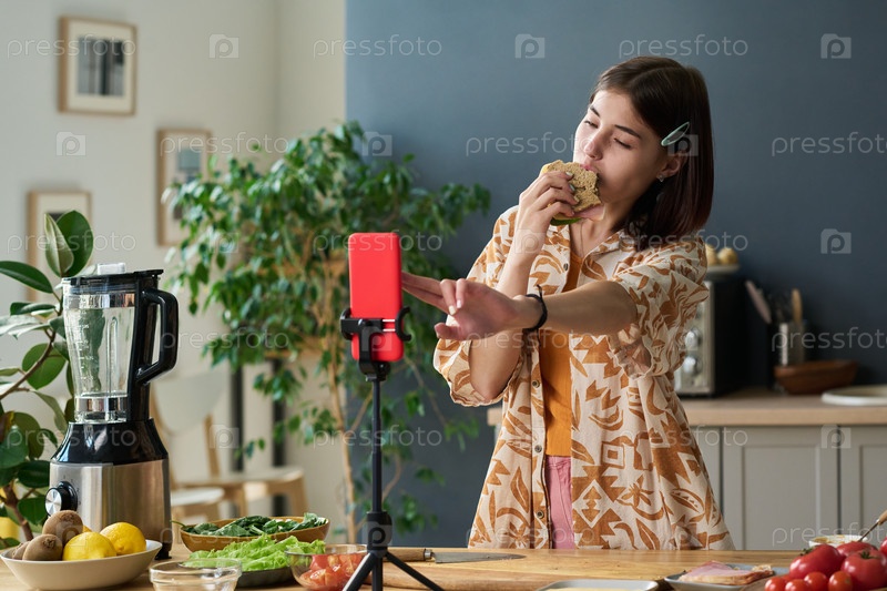 Подростковая девушка записывает видео во время еды бутерброда на кухне