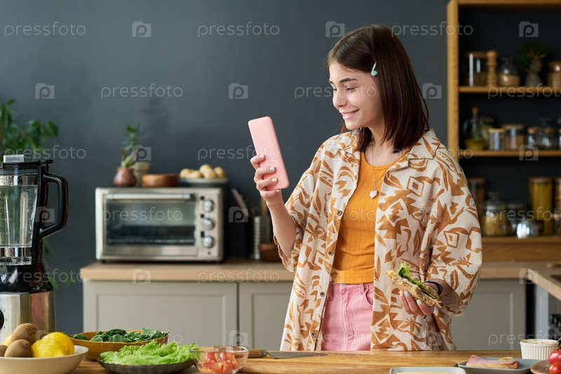 Девушка-подросток улыбается, используя смартфон и готовя бутерброд