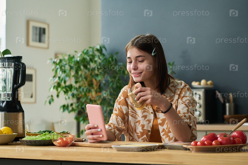 Девушка-подросток ест бутерброд, используя смартфон на кухне