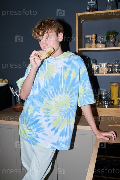 Мальчик-подросток, опирающийся на прилавк наслаждаясь бутербродом в современной кухне