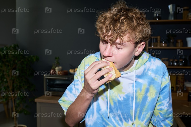 Мальчик-подросток ест бутерброд в помещении с закрытыми глазами, наслаждаясь пищей